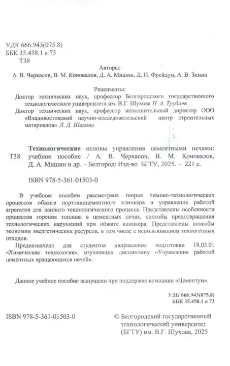 Доценты кафедры Технологии цемента и композиционных материалов А.В. Черкасов, В.М. Коновалов, Д.А. Мишин совместно с представителями цементной отрасли Д.И. Фрейдун и А.В. Зининым издали учебное пособие "Технологические основы управления цементными печами".