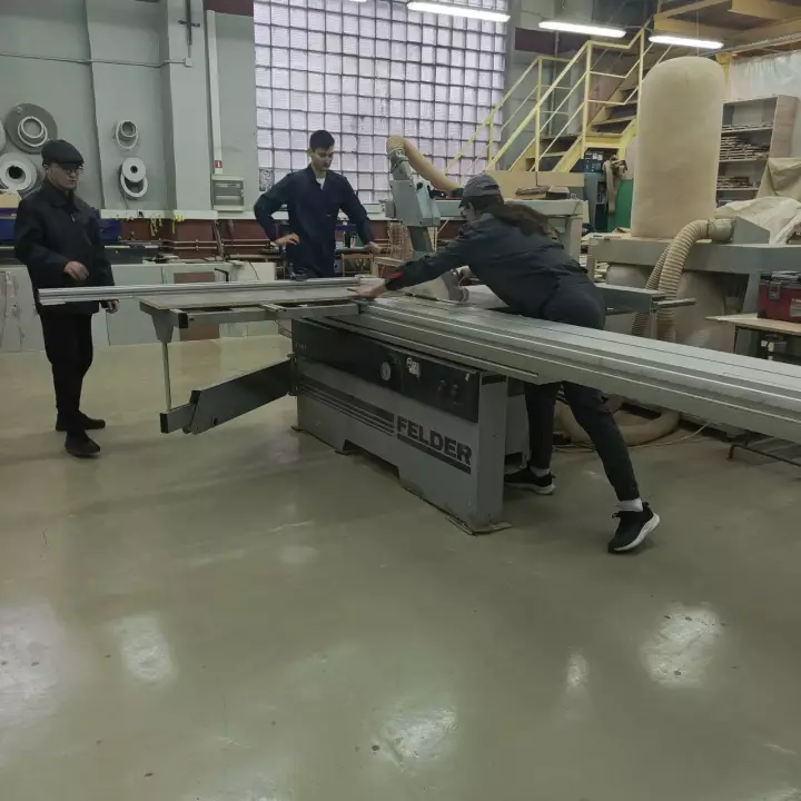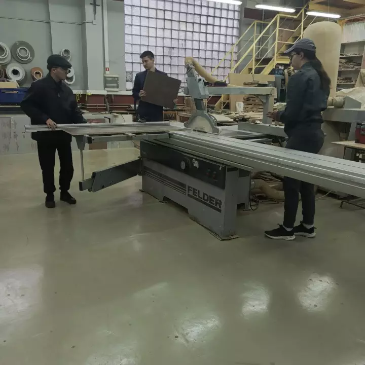 Первым этапом работы стал раскрой плитных материалов, который был осуществлен с использованием форматно-раскроечного станка. Данный станок позволил обеспечить высокую точность и минимизировать количество отходов, что является критически важным фактором в современном мебельном производстве. После раскроя студенты приступили к кромкованию деталей, используя ПВХ кромку. Этот этап работы обеспечил защиту кромок от механических повреждений и повысил эстетические характеристики готового изделия.