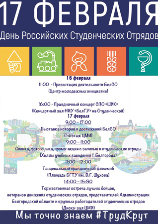 17 февраля в на площади БГТУ им. В.Г.Шухова с 9:00 отмечается День Российских студ. отрядов. Пройдут следующие мероприятия: промо-акция, фотовыставка-сушка, флешмоб. Затем в ЦМИ пройдет торжественное собрание.