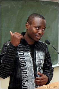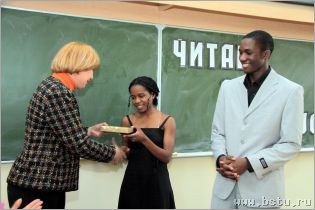 As the board of judges was making the final scoring, Russian language teachers recited their favourite verses. BSTU named after V.G.Shukhov boasts itself for creating favourable conditions and technical support to make forums and events successful. The contestants and supporters’ groups felt comfortable in a new lecture hall and also could see the score of the candidates on the screen. That is why nobody was surprised to hear the name of the main award winner - Martin Ruwewe. He was not only distinguished for his expressive performance, but deserved praise for correct pronunciation, when reciting “I cannot make expensive gifts for your birthday…”. Together with P.Tasila Josephine he also won a prize from the audience. The young man and the girl are very much concerned about the theme of war, which was the reason for reciting «Talk with the grandpa» by L.Dolzhenko, with simultaneous screen video presentation. Phai Phearak, who proved that “there are no uninteresting people….” with the poet E.Evtushenko, won the second prize and Nelson Shamutea could address his African girlfriend in a special way with “Wait for me” by K. Simonov and won the third prize. Souvenirs were presented to the winners, but the biggest and most valuable gift was presented to everyone in the hall - a chance to be distracted from daily routine and enter the world of high spirits and pure feelings, to touch the vivifying spring of Russian poetry.