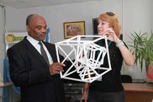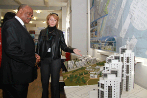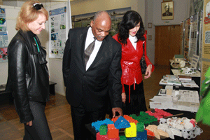 Post-graduate students of the section "Nanotechnology in building materials" communicating with the distinguished guests with ease and finally handed over samples of materials made with the use of nanotechnology.