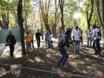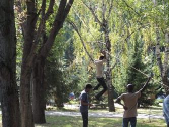 In conclusion, everyone can test himself when performing various tasks on a rope, suspended between the trees in the Victory Park.