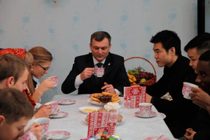 The guests were welcomed by the old Russian tradition - in national costumes and " bread and salt" . Introducing the university students with their successes and plans for the future, the welcoming hosts and the visitors got together round the table with homemade bagels , cakes , jam and honey.