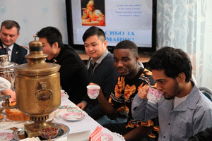 Naresh Kumar told about the history of the Indian tea. This is his first year at the university , so he is not very fluent in Russian . Help in translating was provided by a Zambian friend Jonathan .