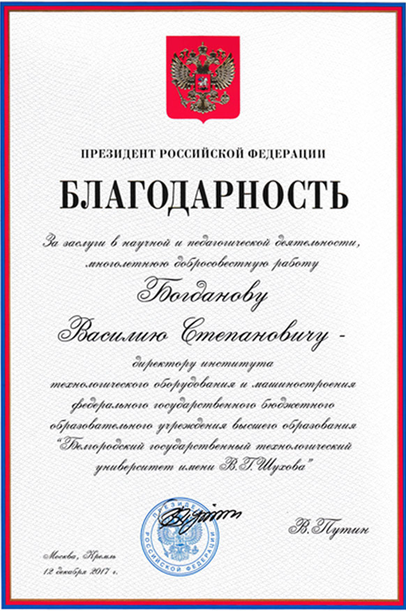 Professor from Belgorod State Technological University named after V.G. Shukhov awarded the Appreciation letter from the Russian President