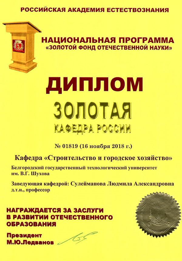 The Department of Construction and Municipal Economy was awarded the title “Golden Department of Russia”. The successes and achievements of the department became the basis for obtaining high status. The competition commission of the national program “The Golden Fund of Russian Science”, which is held under the auspices of the Russian Academy of Natural Sciences, awarded the department of construction and urban economy of the BSTU named after V.G. Shukhov for merits in the development of national education diploma "Golden Department of Russia."
