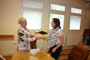 The diploma, award and memorable badge were presented to Victoria Ryapukhina during the meeting and business negotiations at the university's rector's office in Kosovska Mitrovica, where she was invited as a representative of the BSTU named after V.G. Shukhov.