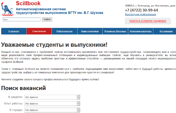 In today's difficult time of the isolation period, when the whole world is experiencing the consequences of the coronavirus pandemic, we tried to provide for the possibility of remote employment and additional earnings for our students in their free time from the educational process. The Ссillbook automated system of employment created at the university offers a number of vacancies for working on a remote site, without direct social contact with clients. The university itself is one of the employers, for example, our students and undergraduates successfully work in the university media center, the employment center, the headquarters of student groups, the institute of correspondence education, the admissions committee and a number of other departments of the university. The guys not only significantly improve their financial situation, but also gain invaluable experience working with modern IT technologies, process management, marketing and communications. Many works are performed remotely, in free time from the educational process.