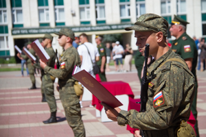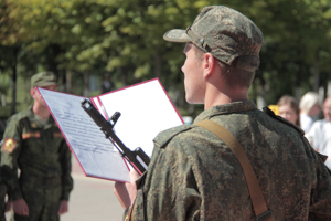 01Each cadet, alternately leaving the standing position, read aloud the text of the Military Oath, swearing an oath “to sacredly observe the Constitution of the Russian Federation, strictly comply with the requirements of military regulations, orders of commanders and chiefs. I swear to fulfill my military duty with dignity, to courageously defend freedom, independence and the constitutional order of Russia, the people and the Fatherland. "