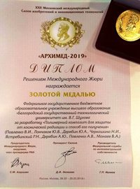 As a result of cooperation, the development of "Polymer composite for protection from space radiation and a method for its production" (authors Pavlenko V.I., Kuritsyn A.A., Popova E.V., Glagolev S.N., Cherkashina N.I.), presented at the 24th Moscow International Salon of Inventions and Innovative Technologies "Archimedes-2019", was awarded a gold medal.