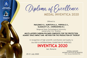 Moreover, the project of the BSTU employees. V.G. Shukhova took part in the joint exposition of Russian inventors under the auspices of the Archimedes club at the 24th International Exhibition of Inventics INVENTICA-2020 (Iasi, Romania). The presented development "Multilayer polymer-carbon composite for protection against space impact and a method for its production" was also awarded a diploma and a medal.