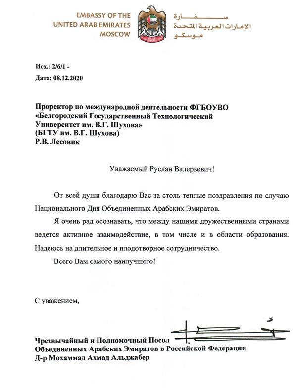 On the 2 nd of December, the UAE celebrated The Independence day. BTU named after V.G. Shukhov kindly have send congratulation letter to the Embassy of the UAE. Few day ago we received the letter from the H.H. Mr. Ambassador of the UAE -dr. Mohammad Ahmad Aljaber.He kindly thanked vice head in international affairs dr. Lesovik R.V. and the head of the university.