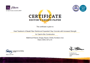 According to the editorial board of the international scientific publication "Fibers", which is part of Scopus Q1 and Web of Science (ESCI), an article by Makhmud K., Klyuev S., Koroteev D., Chiadighikaobi PC, Fediuk R., Olisov A., Vatin N., Alfimova N. 2020.