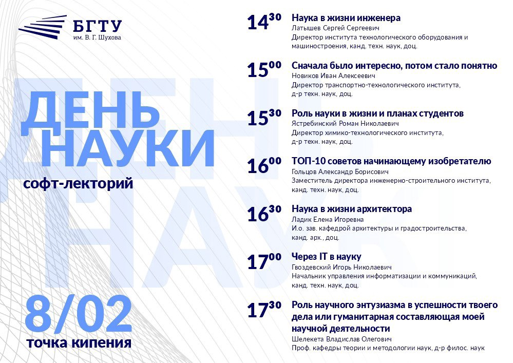 8 февраля, в День российской науки, в Точке кипения БГТУ им. В.Г. Шухова состоится софт-лекторий «Science-траектория», где ученые БГТУ им. В.Г. Шухова расскажут о своем научном пути от самых истоков, ответят на вопросы: как начать заниматься наукой, как стать ученым, как и чем может помочь вуз в становлении и развитии научной деятельности.