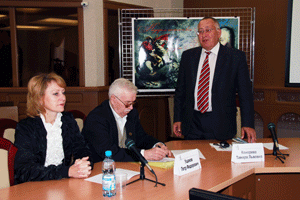На пленарном заседании с докладом, содержащим интересные исторические факты выступил председатель Белгородской общественной палаты, к.и.н., проф. В.В. Овчинников. В частности, Виктор Васильевич отметил, что в Белгороде в ознаменование победы под Бородино был построен Преображенский Собор, а находящаяся в нем икона «Николая Ратного» вдохновляла воинов на подвиг. «Служб а в армии для простого народа была повинностью, а для привилегированных слоев — долгом и честью!» — подчеркнул оратор.