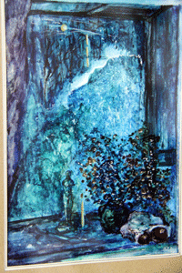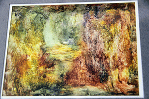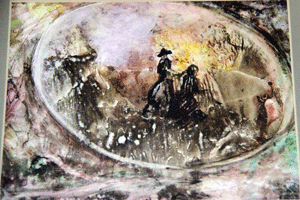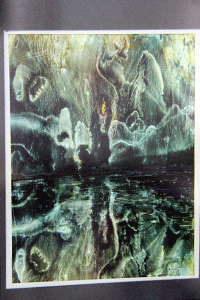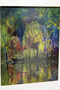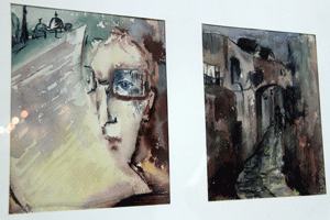 Большинство представленных на выставке работ выполнены в технике «монотипия». (На стекло наносится краска, а потом накладывается лист бумаги. Уже потом художник, усиливая отдельные детали, создает свою картину.)