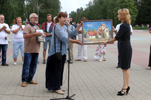 Картина была вручена представителю БГТУ им. В.Г. Шухова - директору музейно-выставочного комплекса Т.Л. Коноревой. Пользуясь случаем, Тамара Львовна пригласила присутствующих художников к сотрудничеству и предложила организовать выставки их работ в университете.