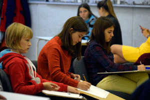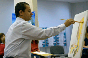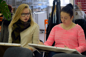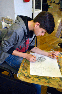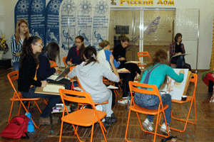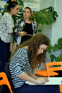 Анна Белоковаленко ( 2 курс, дизайн архитектурной среды): «Совершенно разные техники, все абсолютно по-разному рисуют. У них более живая манера письма. Мы намечаем карандашом, а они сразу рисуют краской – так уверенно! Сразу видно - мастера!»