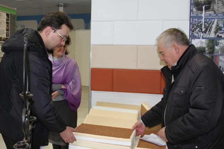 Группа авторов во главе с профессором В.П. Кожевниковым представила разработанную на кафедре энергетики  теплотехнологий  фасадную термоплитку, изготовленную из пенопласта и декорированнную  мраморной крошкой.  Термоплитка соединяет в себе две важные функции: утепления и внешнего  оформления. Преимущества разработки – в  ее быстром монтаже, легком весе  и отсутствии нагрузки на фундамент.