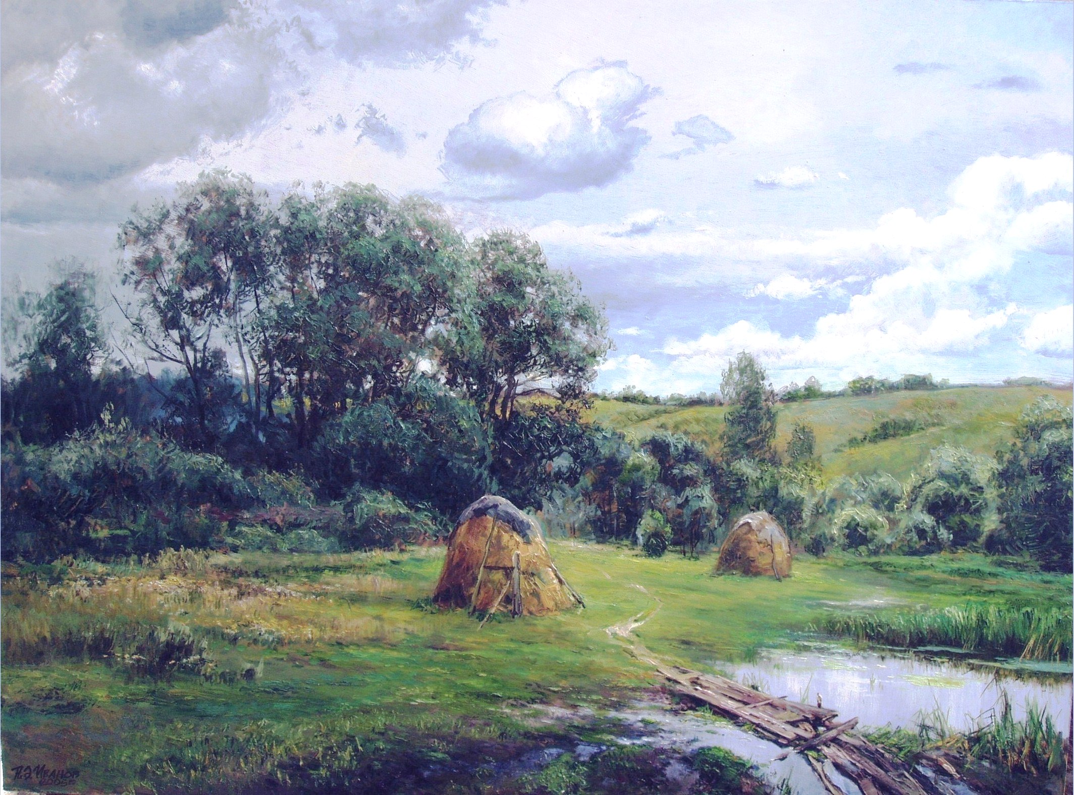 20 картин Александра, выполненных в теплых, насыщенных тонах, запечатлели знакомые уголки родной природы. Это такие работы, как «Солнце садится», «Ромашки», «Оттепель».