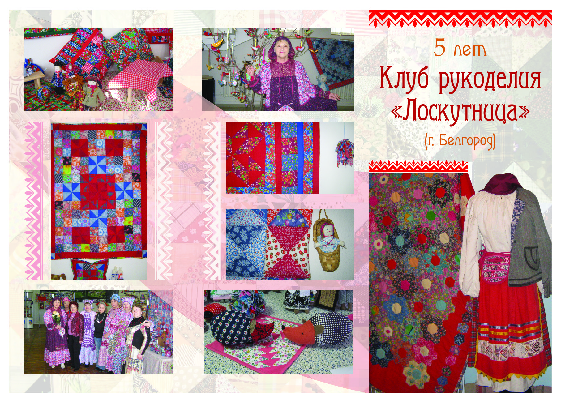 Члены клуба - Скрябикова Елена, Кузовкина Зоя, Загородняя Любовь, Лемза Любовь, Дембская Галина – талантливые женщины, не только освоившие за годы премудрости ремесла, но и ставшие хранительницами и берегинями народных традиций. Тех, кто через свои работы дарит радость и красоту родным и близким людям. За пять лет работы клуба эти женщины не только освоили премудрости ремесла, но и познакомились с основами русской традиционной культуры. Они шьют лоскутные одеяла и панно, одежду в русском стиле, мастерят куклы и народные игрушки. Создают коллективные работы, занимаются реконструкцией музейных образцов, преимущественно используя отечественные ситцы, часто из «бабушкиного сундучка». Коллекции одежды «Барыня» и «Русские ватники» радуют не только мастериц, но и окружающих. Мастерицы принимали участие в работе Международного фестиваля лоскутного шитья в г. Суздале (2016г.). В июле 2017 года работы клуба были представлены на лоскутном фестивале во Франции.