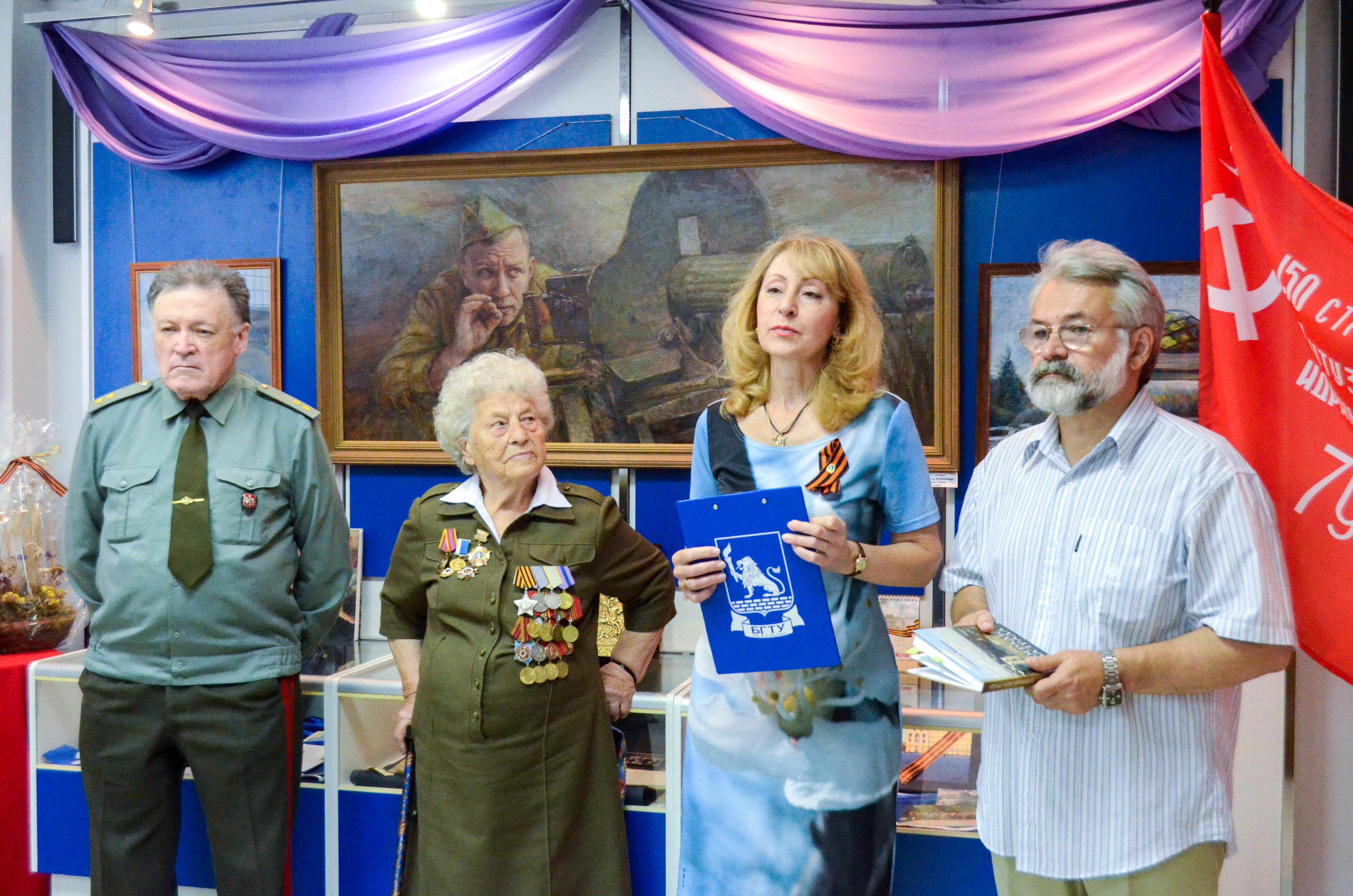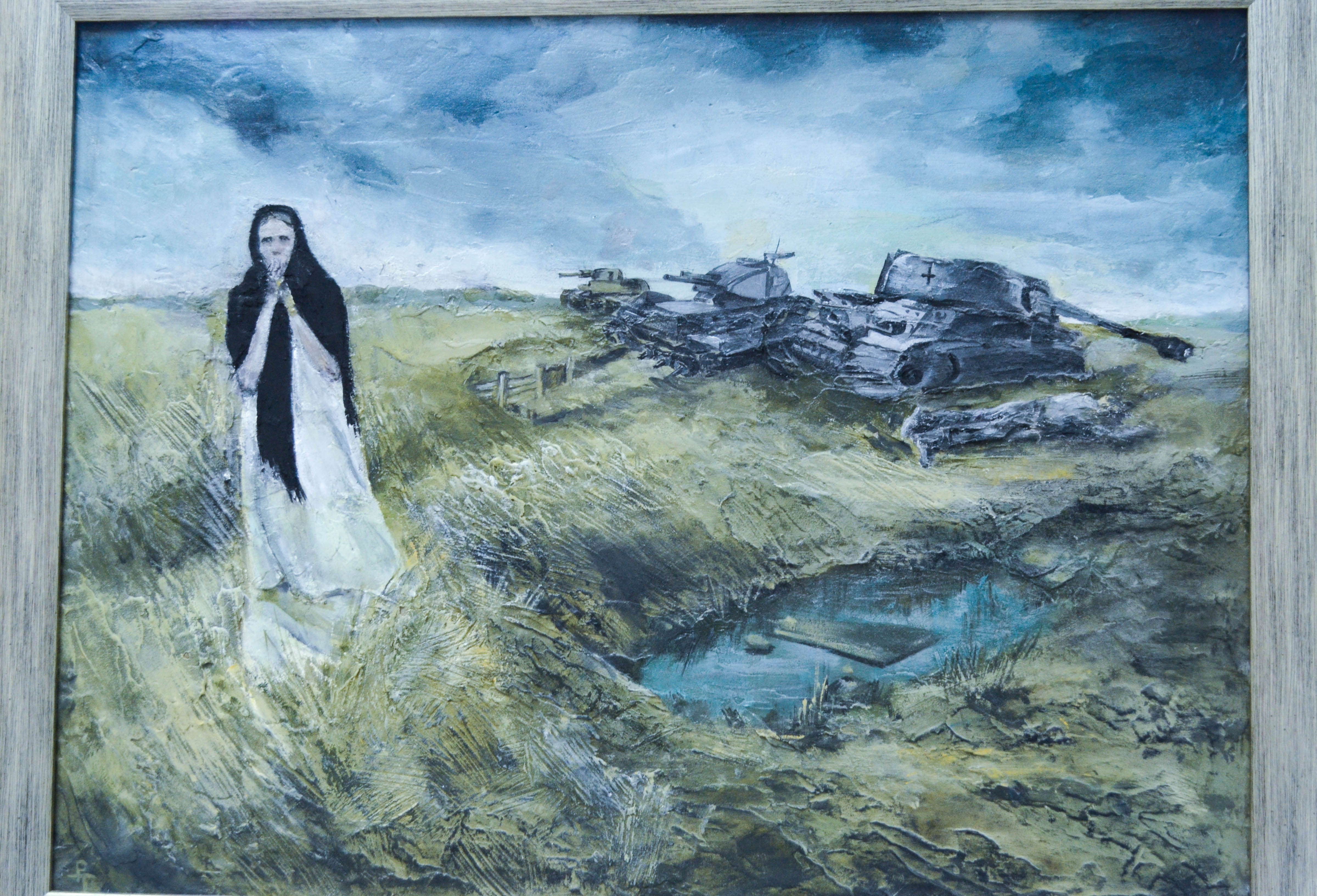 "Прохоровское поле" – выставка работ под таким названием открылась сегодня в музее БГТУ им. В.Г. Шухова. Авторские работы членов Творческого Союза художников России и Международной федерации художников Елены Коротун, Эммы Цыбульниковой и Татьяны Решетняк, а также членов Союза художников России Александра Иванова и Маргариты Кудрявцевой, сотрудника БГХМ Владимира Половнева. Все картины объединены общей темой – «75-летие Курской битвы». И в каждой по-своему раскрывается масштаб военного лихолетья – у кого-то в виде вдовы, получившей похоронку, у кого-то в образе пулемётчика, ожидающего атаки, а некоторые полотна авторы посвятили суровым будням фронтового тыла. Но каждая из работ пронзительна настолько, что сразу погружает в те годы, о которых мы знаем только из книг, кинофильмов и рассказов ветеранов.