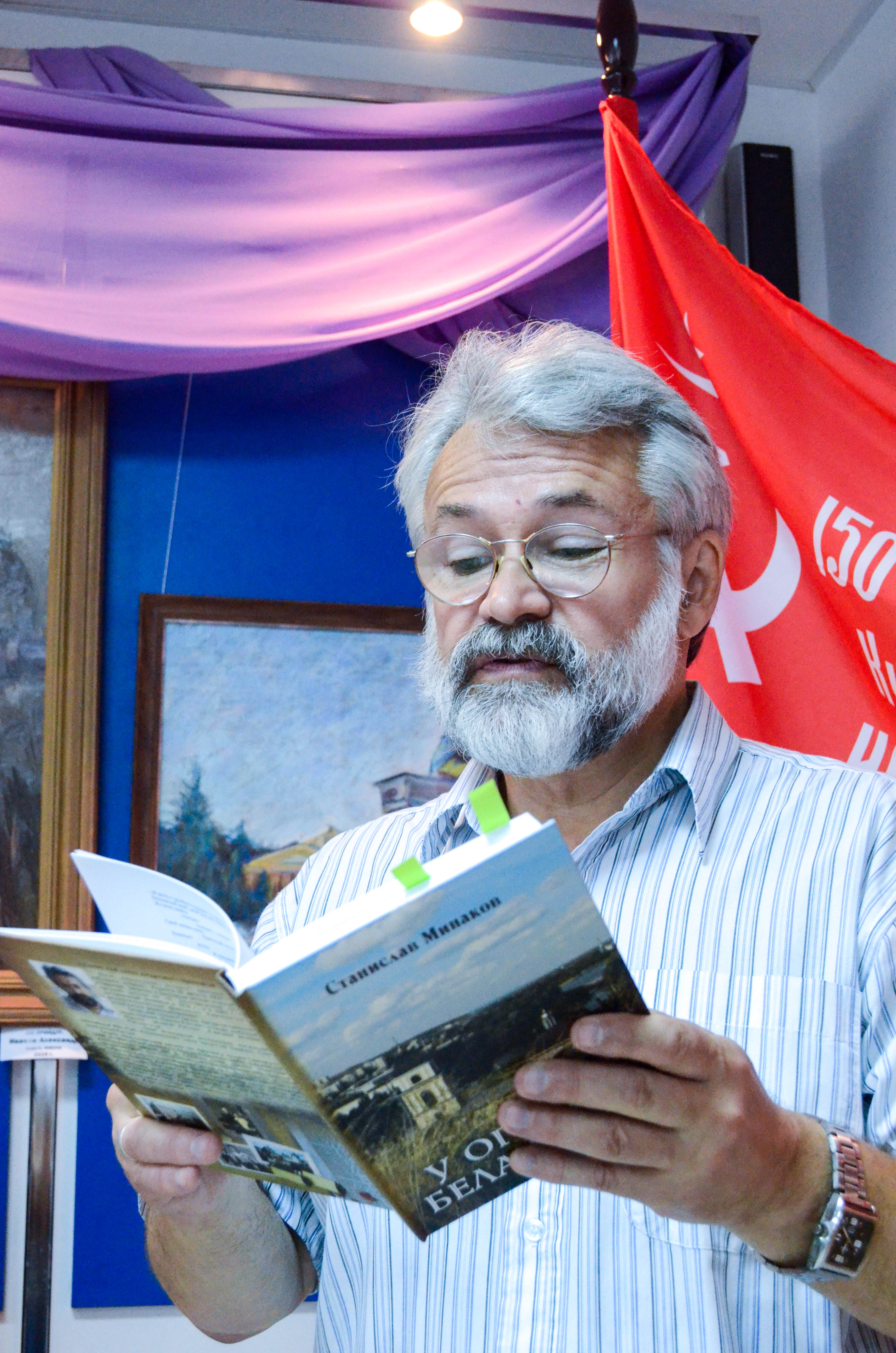 Поэтическую точку в открытии выставки поставил Член Союза писателей России, Русского ПЕН-центра (Москва), лауреат международных и всероссийских литературных премий Станислав Минаков. Он прочитал собравшимся отрывок из поэмы, посвящённой исторической дате – 12 июля. А написана она была под впечатлением поездки на Прохоровку, которая состоялась именно 12 июля 1986 года, а также общения с жителями села Прелестное, которое оказалось в те годы в самой гуще событий. Станислава Александровича тогда потряс до глубины души обычай, когда женщины из всех домов выносят и накрывают столы, чтобы любой прохожий мог помянуть всех павших в этих местах, всех не пришедших с войны солдат: