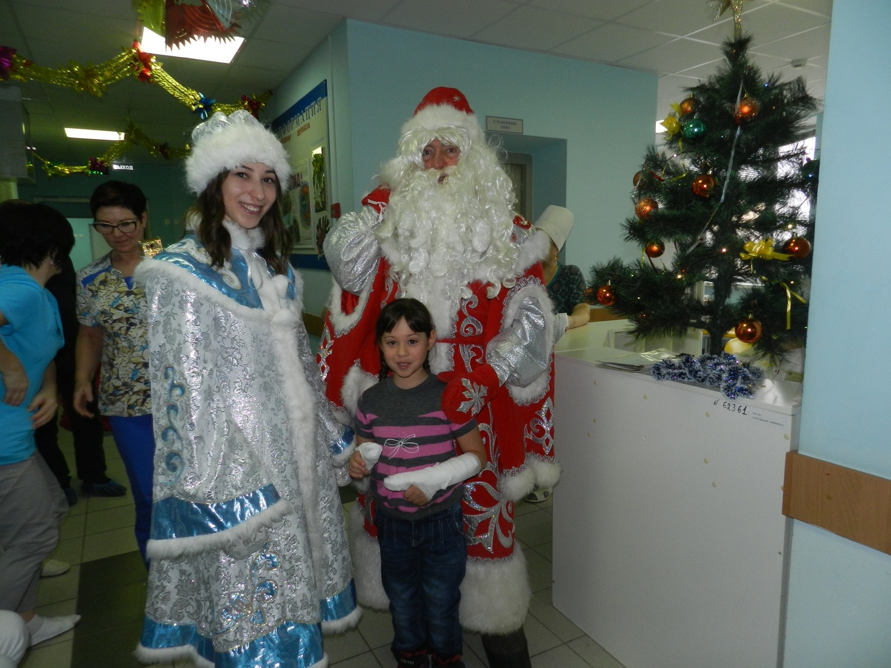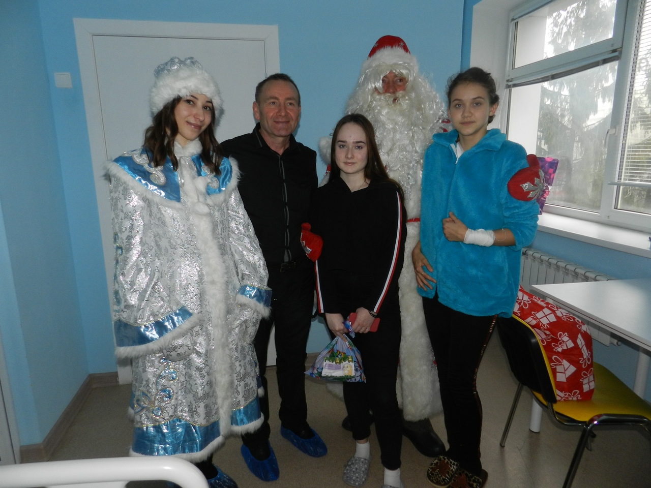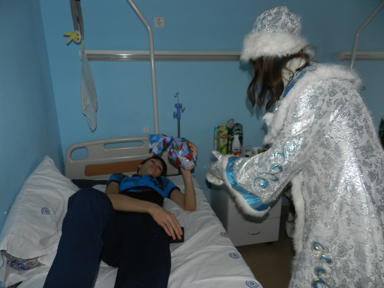 Чтобы поддержать и порадовать ребят, и, может быть, ускорить процесс выздоровления, 28 декабря в 11 часов к ним в гости пришли со сладкими подарками Дедушка Мороз и Снегурочка.