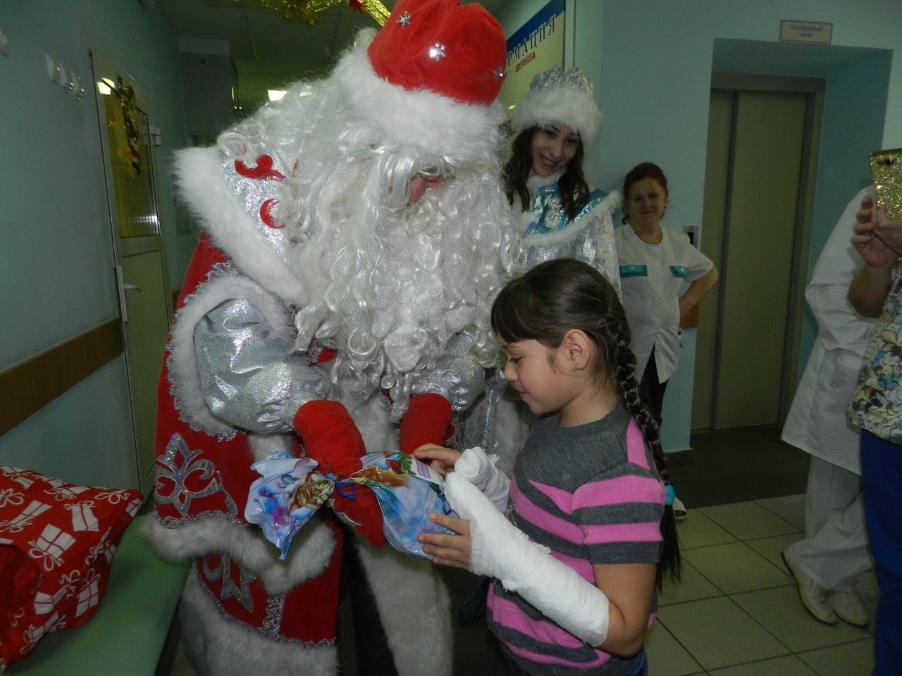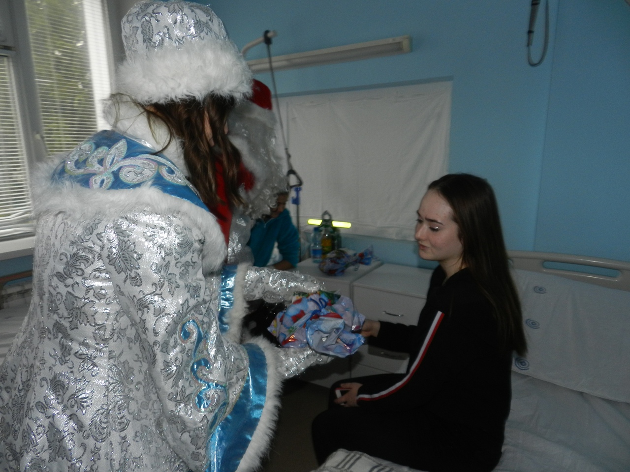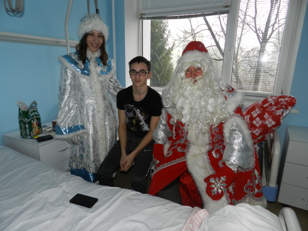 Чтобы поддержать и порадовать ребят, и, может быть, ускорить процесс выздоровления, 28 декабря в 11 часов к ним в гости пришли со сладкими подарками Дедушка Мороз и Снегурочка.