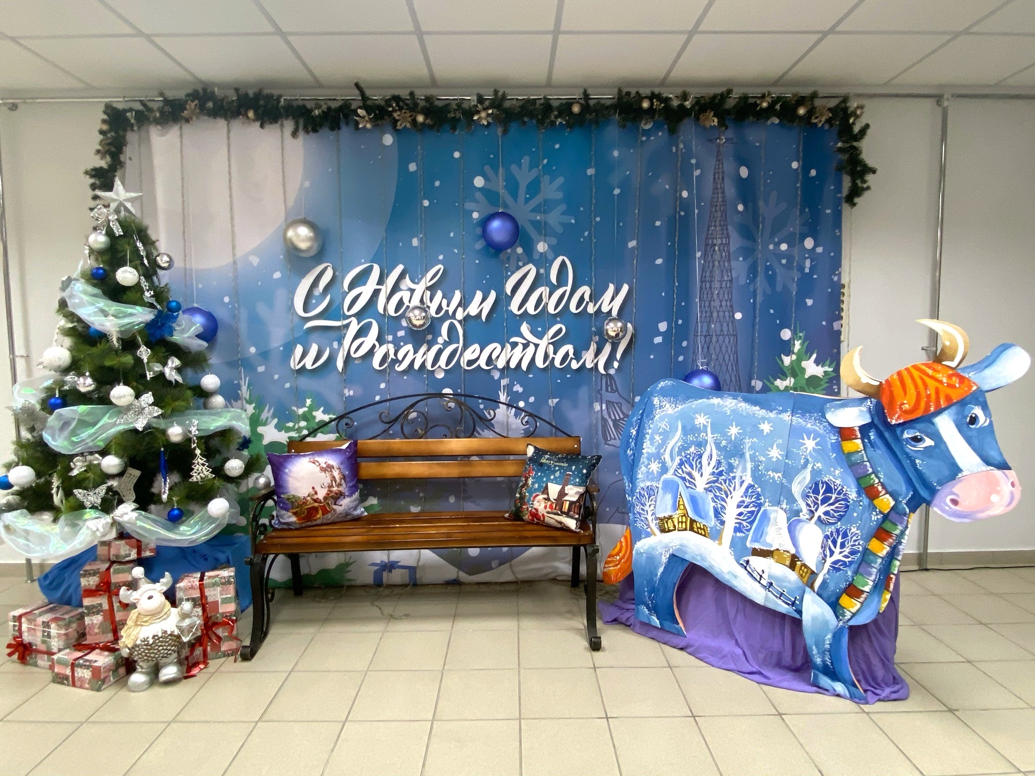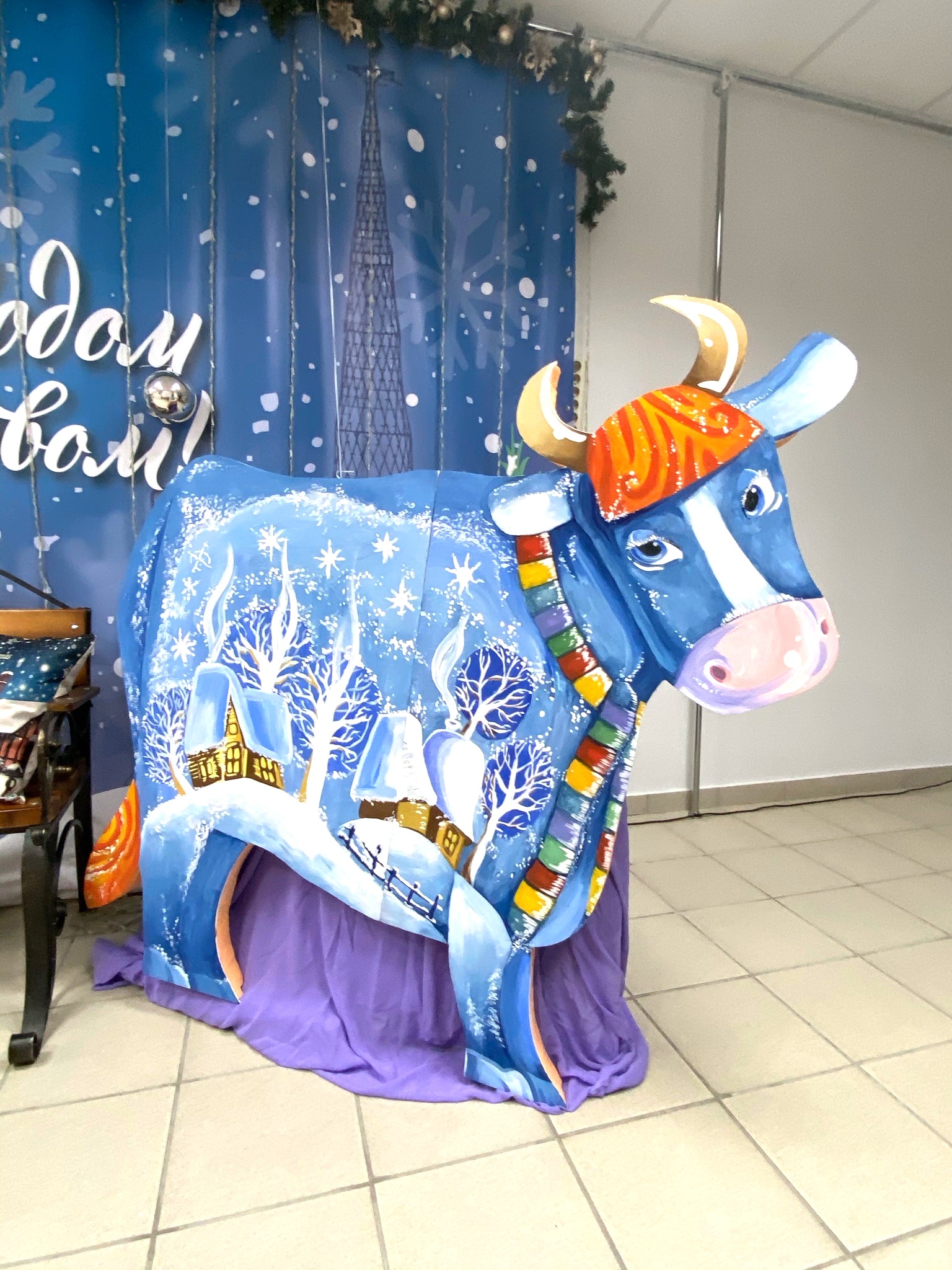 центре фотозоны стал символ будущего года. Чудесную фигуру коровки, красиво расписаной зимними пейзажами, создали талантливые студенты кафедры дизайна архитектурных конструкций.