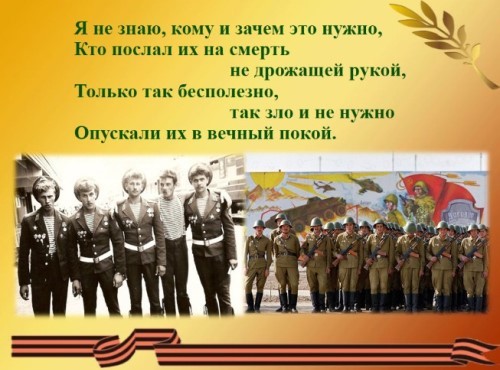 Пусть прошли годы, десятилетия, память хранит все ужасы войны и страх, гибель лучшего друга и мамины слезы. Стереть невозможно воспоминания. Так пусть о вашем подвиге помнят не только однополчане. Пусть хоть раз в году, в День воина-интернационалиста люди скажут, что все это было не зря, что это действительно подвиг. С праздником!