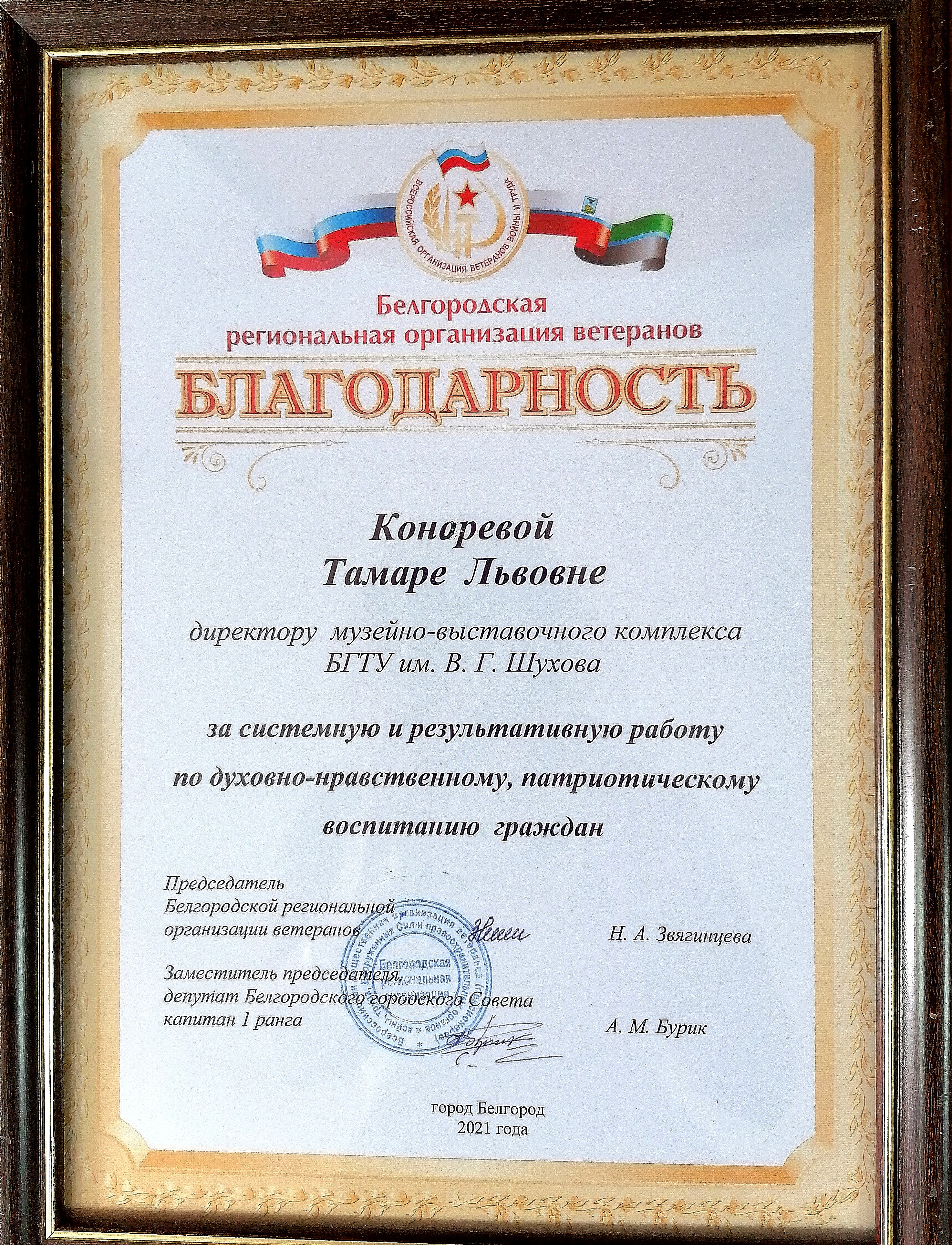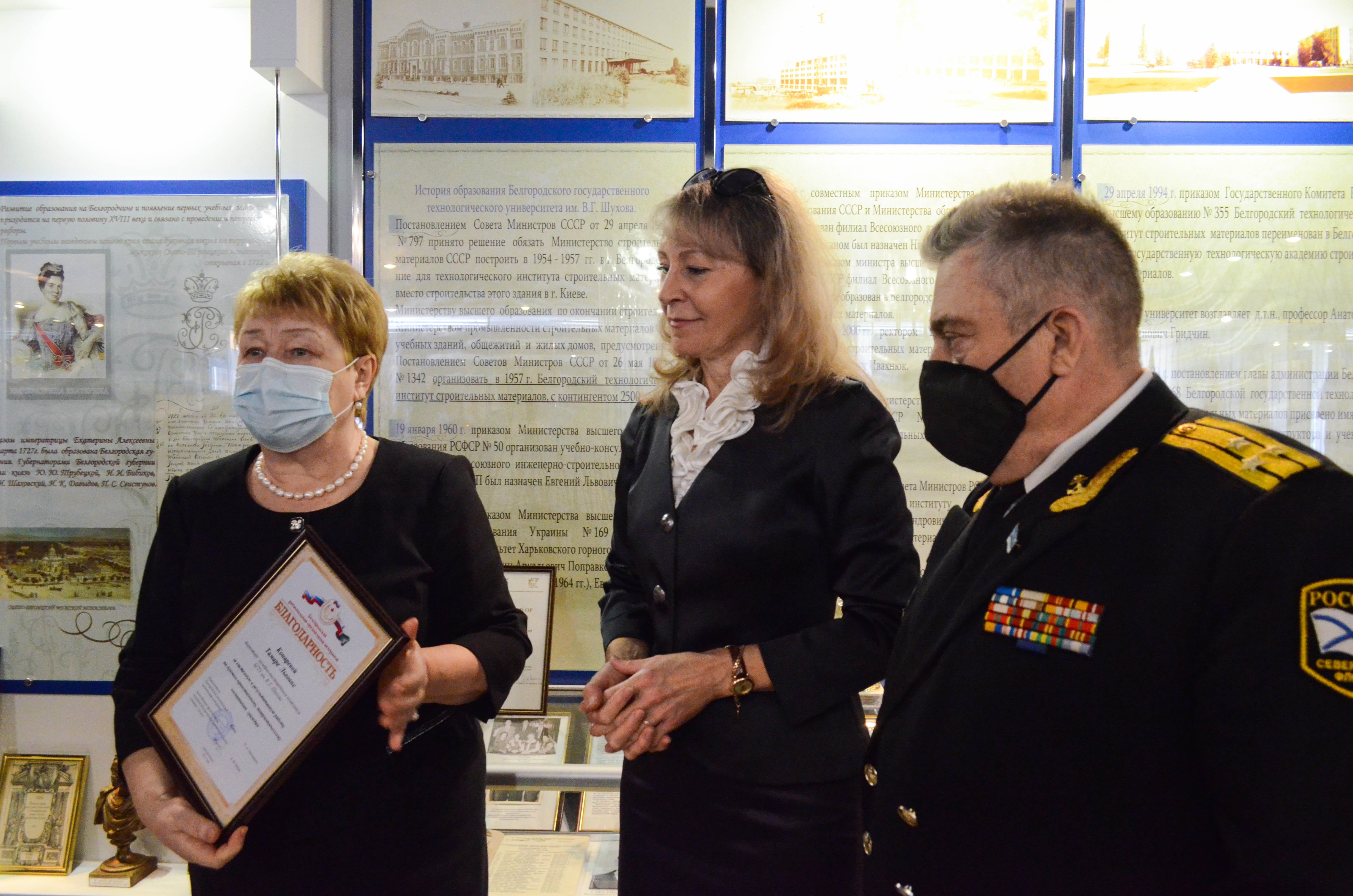 В рамках сотрудничества и взаимодействия с БГТУ им. В.Г. Шухова Белгородская региональная организация ветеранов войны, труда, вооруженных сил и правоохранительных органов провела расширенное заседание бюро Совета региональной организации ветеранов. Участники мероприятия посетили музей вуза, осмотрев экспозицию и выставку о моряках-подводниках. Председатель Белгородской региональной организации ветеранов Н.А. Звягинцева вручила благодарственное письмо директору МВК Коноревой Т.Л.за системную и результативную работу по духовно-нравственному, патриотическому воспитанию граждан.