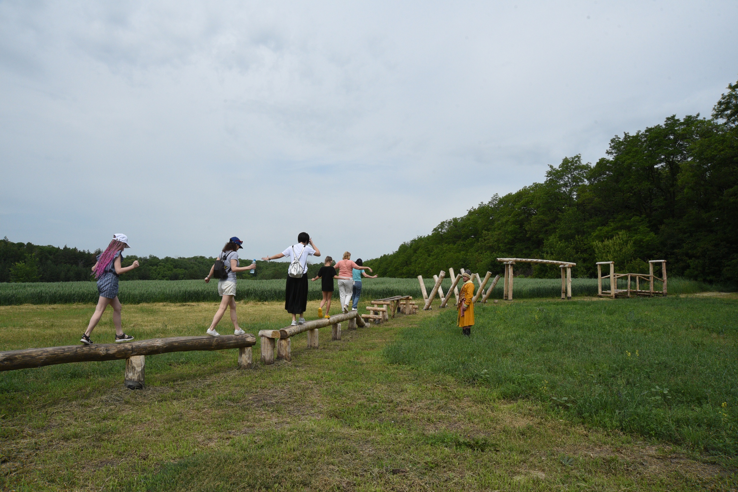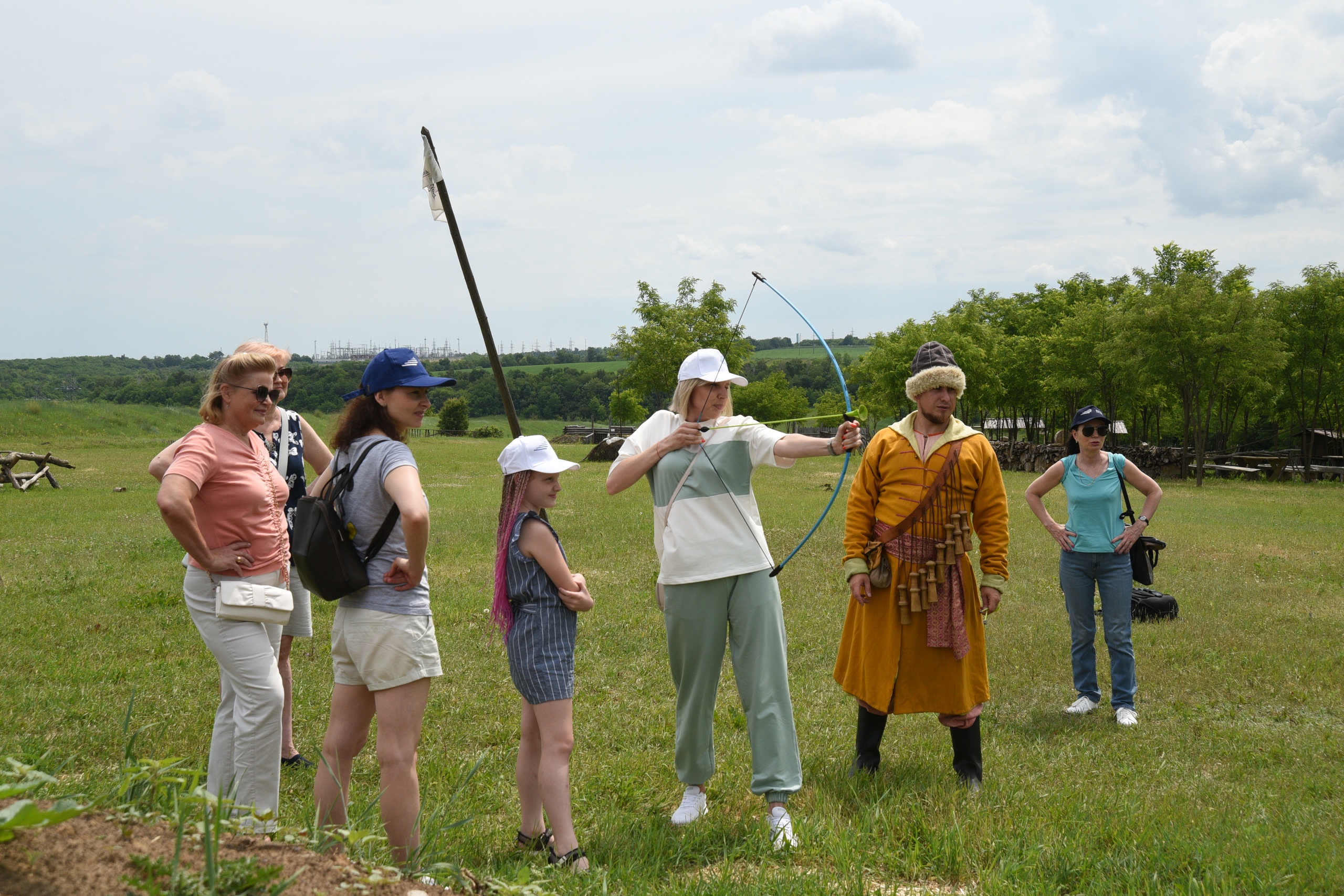 В ходе экскурсии все преодолели обязательную полосу препятствий, пощупали пушечные ядра, постреляли из лука, посмотрели на близлежащие холмы со смотровой башни, отчеканили монеты на память.