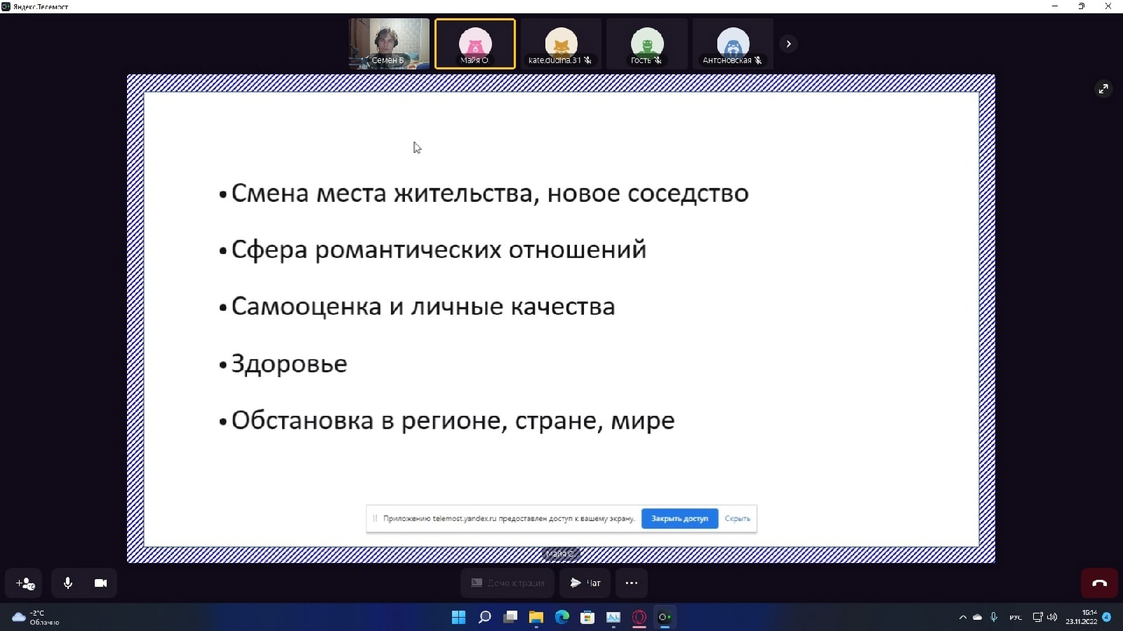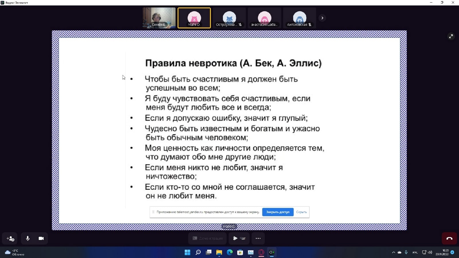 У кураторов групп первого курса сегодня крайне важная задача: помочь студентам преодолеть новые для них сложности дистанционного обучения и при этом оставаться в сообществе и активно взаимодействовать. 23 ноября для группы ПЗ - 221 была организована встреча с руководителем "Точки личностного роста" БГТУ им. В.Г. Шухова Майей Сергеевной Клепак в формате телемоста на платформе Яндекс. Тема "Стрессоустойчивость". Как справится со стрессом в меняющейся реальности? На это и другие важные вопросы студенты получили ответы и практические советы.