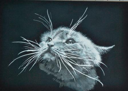Особый интерес вызывает монохромная работа художницы "Кот", выполненная гуашью в технике гризайль.