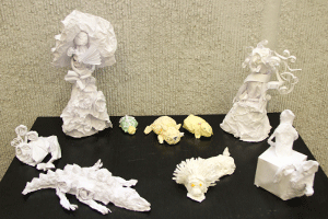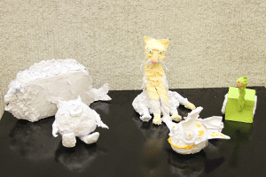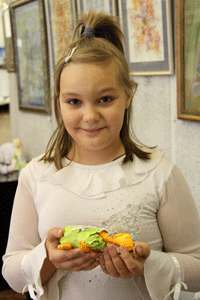 На выставке представлены работы, выполненные в технике «бумагопластика». Из предварительно размоченной и смятой бумаги у ребят получаются симпатичные черепахи, кошки, драконы и даже очаровательные барышни в кружевных платьях с изысканным зонтиками.