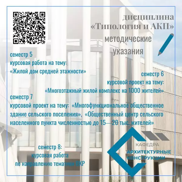 Дорогие студенты! Кафедра Архитектурные конструкции БГТУ им. В. Г. Шухова представляет методические указания по дисциплине «Типология и архитектурно‑конструктивное проектирование»: ваш надёжный помощник в курсовом проектировании! Этот документ — ваш главный ориентир при выполнении курсовых работ и проектов. В нём вы найдёте: - чёткую последовательность действий: систематизированный алгоритм разработки проекта от идеи до финальной презентации; - практические приёмы: систему способов и методов, которые помогут эффективно решать проектные задачи; - конкретные требования: подробные указания по содержанию задания, составу и порядку исполнения проектов; - правила оформления: единые стандарты для графической и текстовой частей работы; - критерии оценки: чёткие параметры, по которым будет проверяться ваша работа. Что особенно важно: - указания обеспечивают единство требований к оформлению, содержанию и качеству курсовых работ; - приведены технико‑экономические показатели, которые необходимо учитывать в проекте; - содержатся ссылки на актуальные ГОСТы, СП и СНиПы; - даны примеры оформления и разбор типичных ошибок. Для кого: Методические указания предназначены для студентов направления подготовки 08.03.01—«Строительство», профиль «Проектирование зданий». Как использовать: Внимательно изучите раздел «Общие требования» перед началом работы. Сверяйте каждый этап проекта с приведёнными критериями. При возникновении вопросов обращайтесь к преподавателю или на кафедру. Скачайте документ прямо сейчас в разделе документы или на официальной страничке кафедры на сайте вуза.