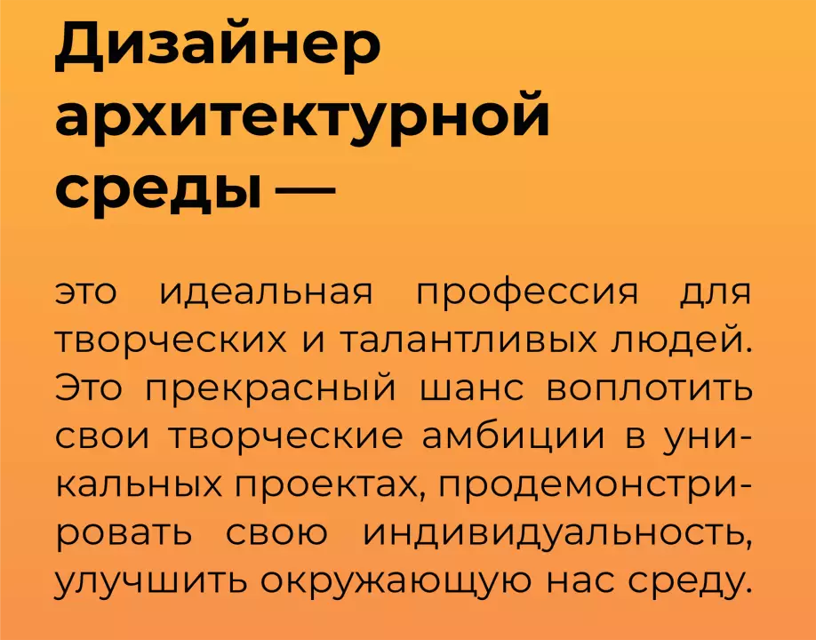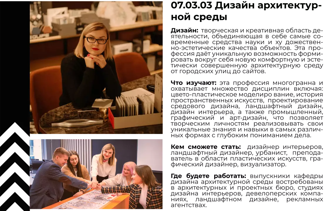 Выбор данной профессии - это возможность сочетать творчество и технические навыки, востребованность на рынке труда в архитектуре, градостроительстве и дизайне, участие в создании комфортной и современной среды для жизни и работы. Кафедра дизайна архитектурной среды — это ваш путь к профессии, где можно реализовать творческий потенциал и внести вклад в развитие городской и жилой среды.