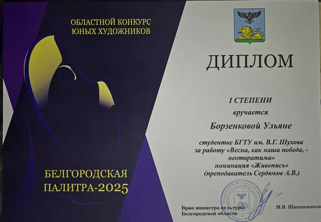 Студентка кафедры дизайна архитектурной среды Борзенкова Ульяна стала лауреатом данного областного конкурса юных художников. За свою работу под названием "Весна, как наша победа, - неотвратима" она была удостоена диплома 1 степени в номинации "Живопись".