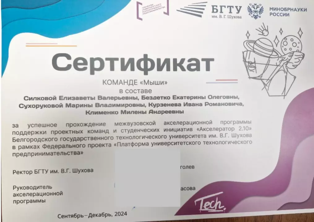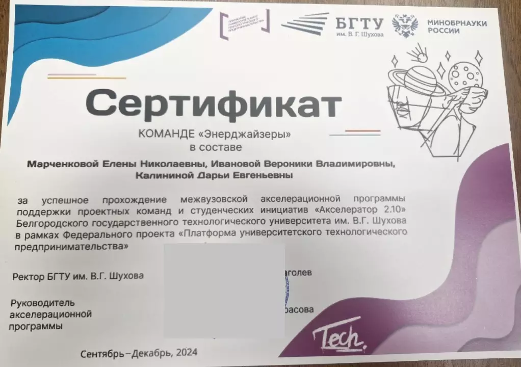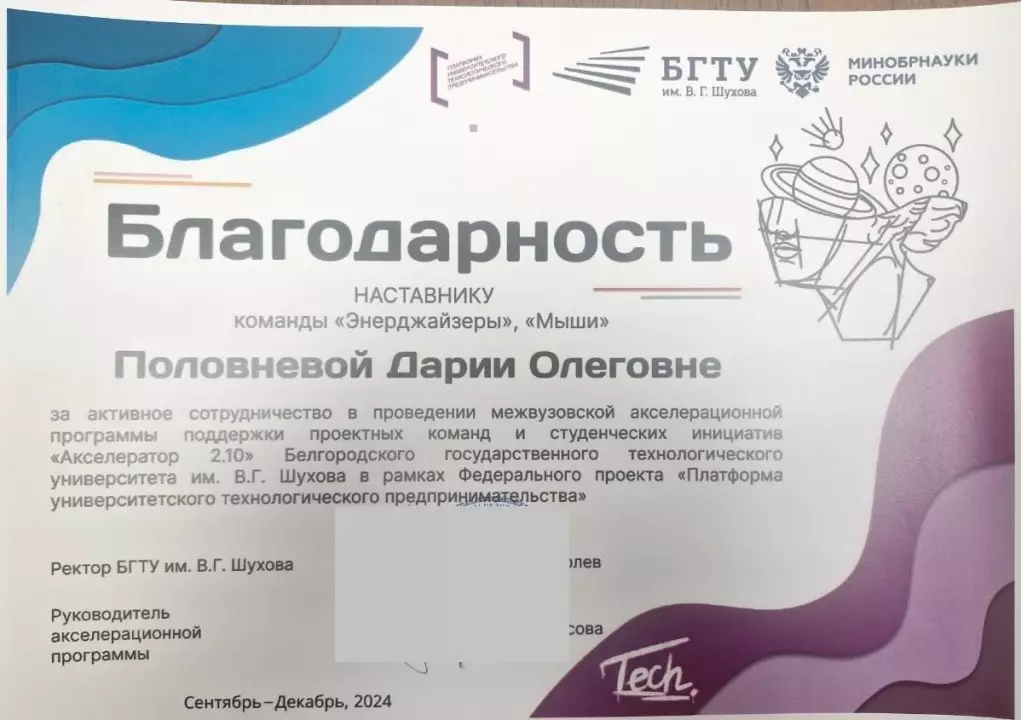Сертификаты командам и благодарность наставнику за успешное прохождение межвузовской акселерационной программы поддержки проектных команд и студенческих инициатив «Акселератор 2.10» БГТУ им. В.Г.Шухова в рамках Федерального проекта «Платформа университетского технологического предпринимательства»