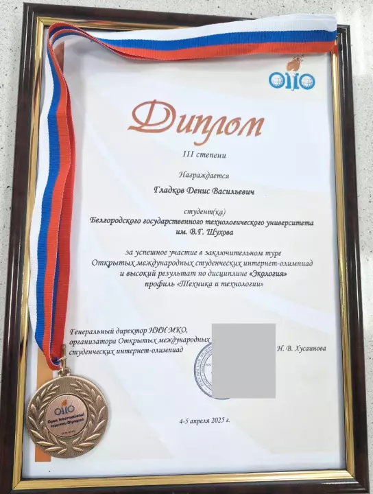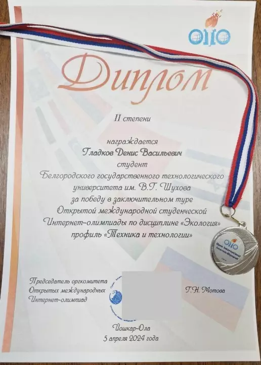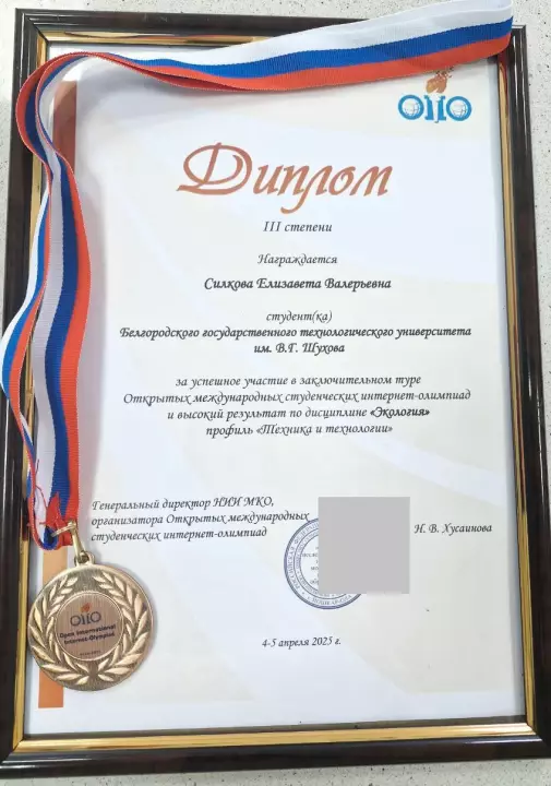 Дипломы студентам и медали за победу в заключительных турах Открытой Международной студенческой интернет-олимпиады по дисциплине «Экология» профиль «Техника и технологии» за 2024-2025 гг.