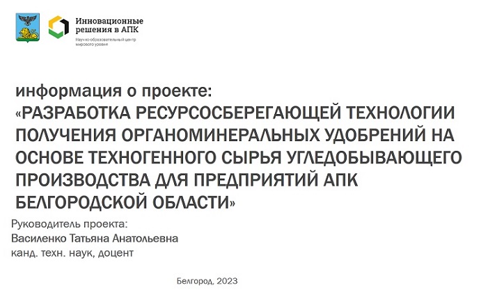 Проект на тему: «Разработка ресурсосберегающей технологии получения органоминеральных удобрений на основе техногенного сырья угледобывающего производства для предприятий АПК Белгородской области». Руководитель проекта: канд. техн. наук, доцент Василенко Татьяна Анатольевна. Грант в форме субсидии из бюджета Белгородской области на оказание государственной поддержки внедрения в производство инновационных технологий в рамках технологических проектов полного цикла.