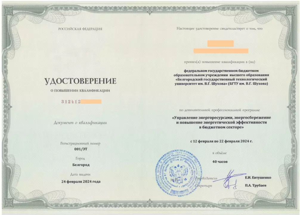 Образовательная программа повышения квалификации разработана в соответствии с образовательным стандартом 40.246 «Специалист по обеспечению энергосбережения и повышения энергетической эффективности», действующего с с 01.09.2023 по 01.09.2029 г., согласована с ОГБУ «Центр энергосбережения Белгородской области». Для слушателей Белгородской области программа включает обучение СУЭР.