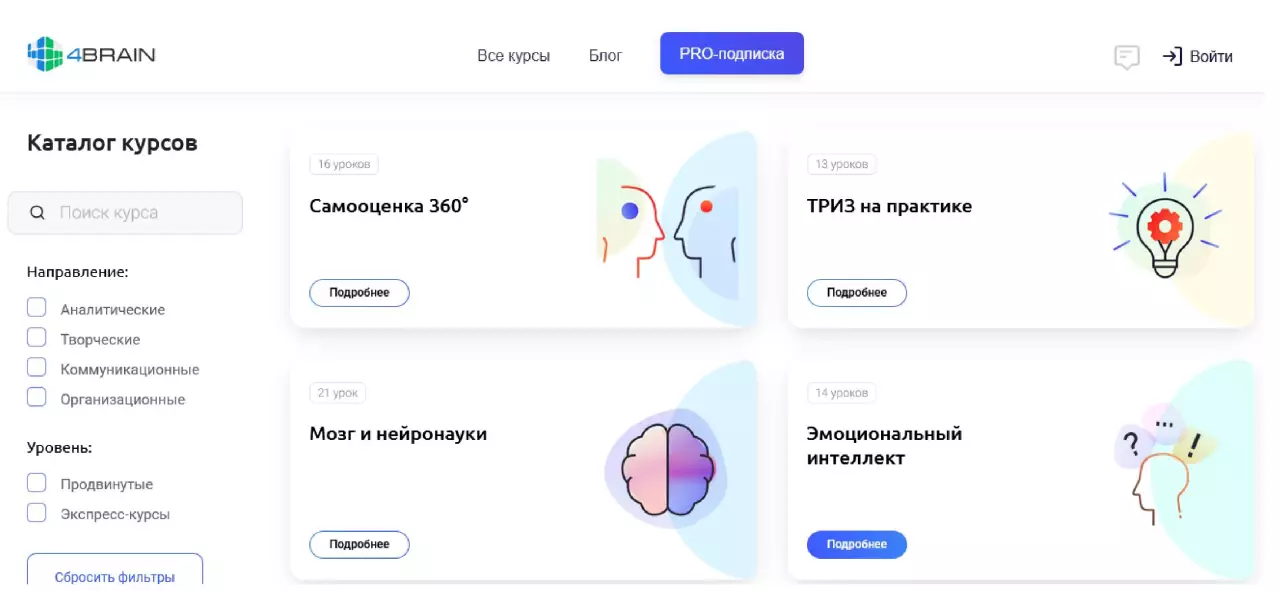 4Brain — ресурсы на русском языке для саморазвития, которые помогут прокачать soft skills. Здесь можно найти лекции по критическому и логическому мышлению, мнемоническим техникам, сторителлингу, риторике и многим другим направлениям.