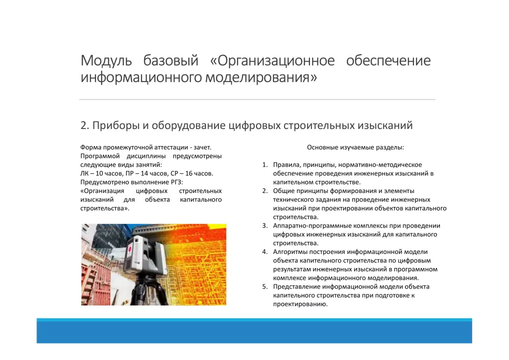 Краткая аннотация курса - теоретические основы применения мобильных лазерных сканеров, в том числе принципы работы лазерного сканера, запуск прибора и выполнение сканирования; первичная постобработка результатов сканирования в ПО; постобработка данных сканирования для решения типовых задач и извлечения полезной информации в специализированное ПО, в том числе построение цифровой модели рельефа/местности по результатам сканирования.