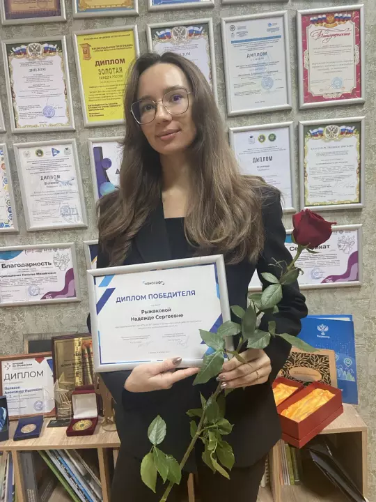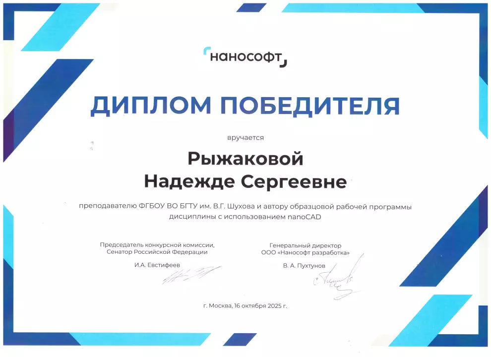 Диплом Победителя от компании «Нанософт» был торжественно вручен старшему преподавателю кафедры Рыжаковой Надежде Сергеевне на заседании Ученого совета БГТУ им. В.Г. Шухова 1 декабря 2025 г.