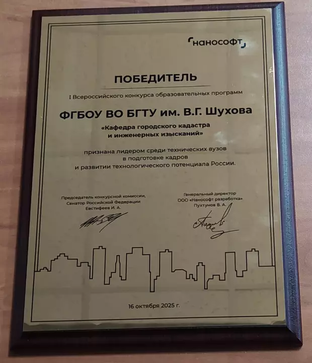БГТУ им. В.Г. Шухова и кафедра городского кадастра и инженерных изысканий стали победителями конкурса в номинации "Геодезия, картография и землеустройство" среди вузов России.