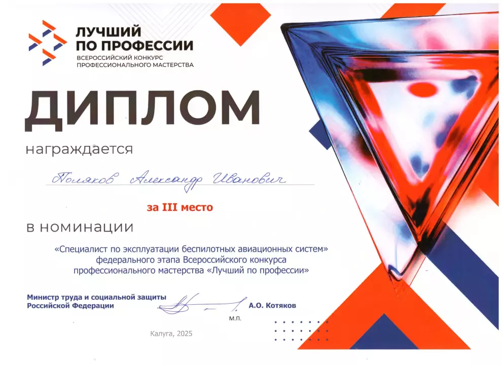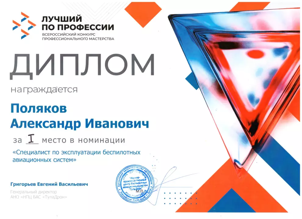 Победителем регионального этапа, занявшим первое место, стал Поляков А.И., что дало ему возможность принять участие в Федеральном этапе конкурса от Белгородской области, который проходил 24-25 июля в Калуге на площадке Федерального технопарка профессионального образования и авиапарка Орешково.