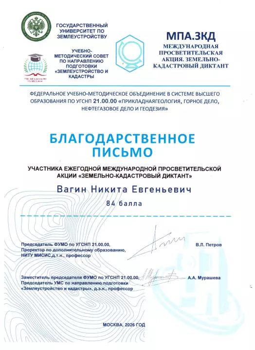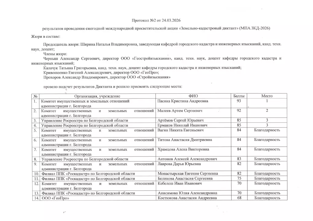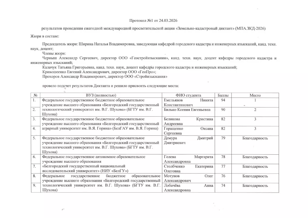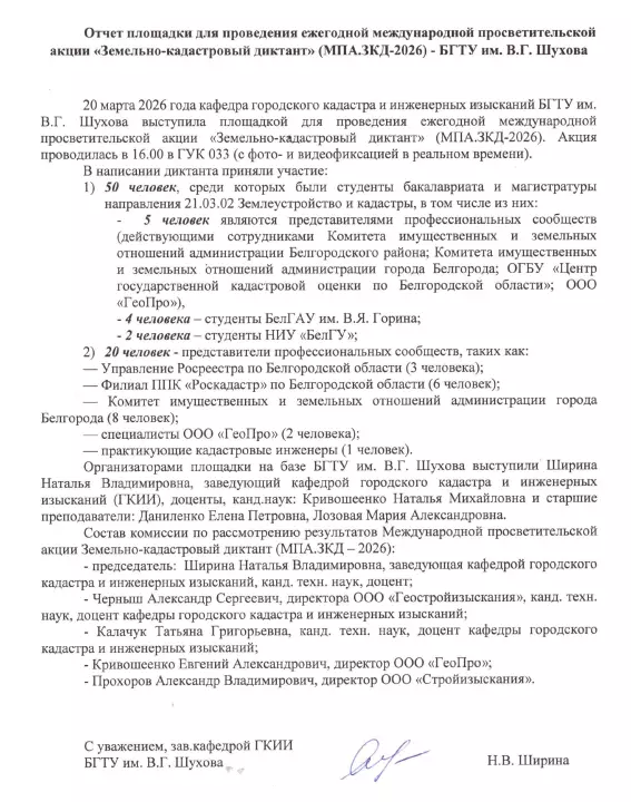 Подведены итоги Земельно-кадастрового диктанта, который состоялся 20 марта на базе БГТУ им. В.Г. Шухова. В акции приняли участие 70 человек, среди которых были как студенты вузов: БГТУ им. В.Г. Шухова, БелГАУ им. В.Я. Горина и НИУ «БелГУ», - так и представители профессиональных сообществ города и области. Комиссия в составе 5 человек во главе с председателем – заведующей кафедрой городского кадастра и инженерных изысканий, канд. техн. наук, доцентом Шириной Натальей Владимировной рассмотрела результаты акции и подвела итоги, которые были изложены в протоколах. Победителям были вручены дипломы, а всем участникам – благодарственные письма. Руководителям организаций, направивших своих сотрудников для участия в акции были подготовлены Благодарственные письма за подписью и. о. ректора БГТУ им. В.Г. Шухова Глаголева С.Н.