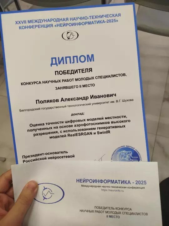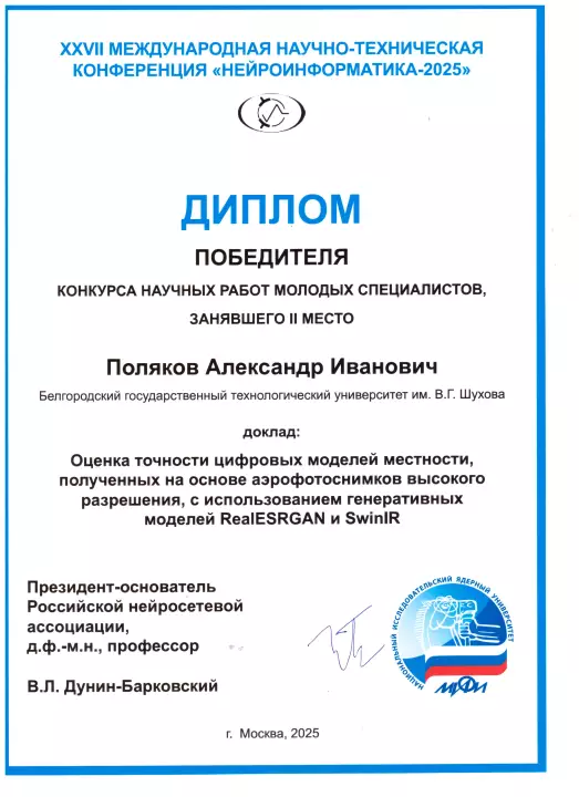 В конференции принял участие ассистент кафедры городского кадастра и инженерных изысканий Поляков Александр Иванович. Он выступил с докладом «Оценка точности цифровых моделей местности, полученных на основе аэрофотоснимков высокого разрешения с использованием генеративных моделей Real-ESRGAN и SwinIR» и занял II место.